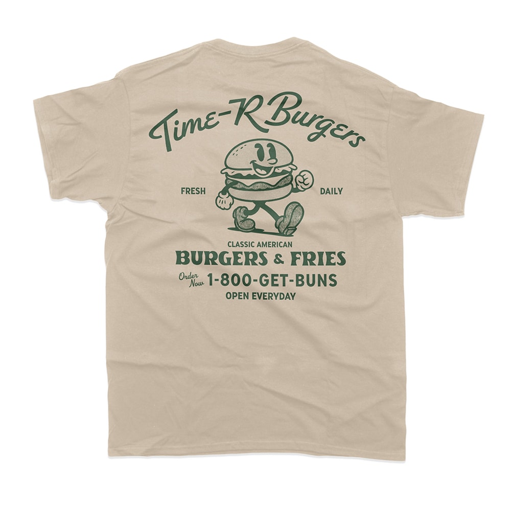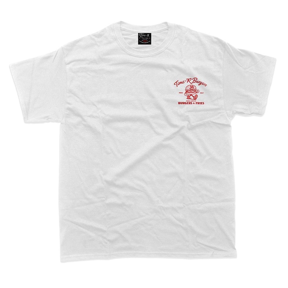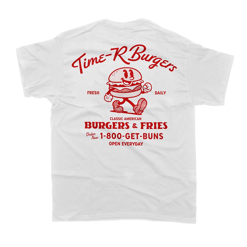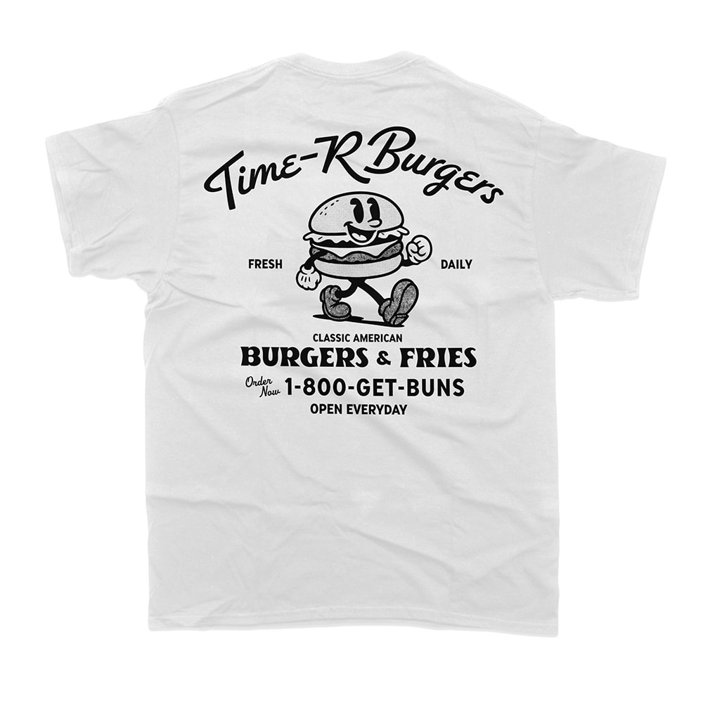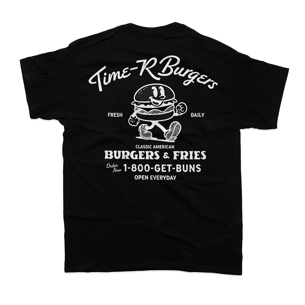Time-R恒例、架空のこんな店あんな店シリーズ。今年はあえての定番バーガーショップ。ジャンクフードをこよなく愛するハートは、何歳になっても現役です。「1-800-GET-BUNS(パンをよこせ)」と背中で叫びつつ、腹筋のことは一旦忘れてガッツリと着こなしてください。